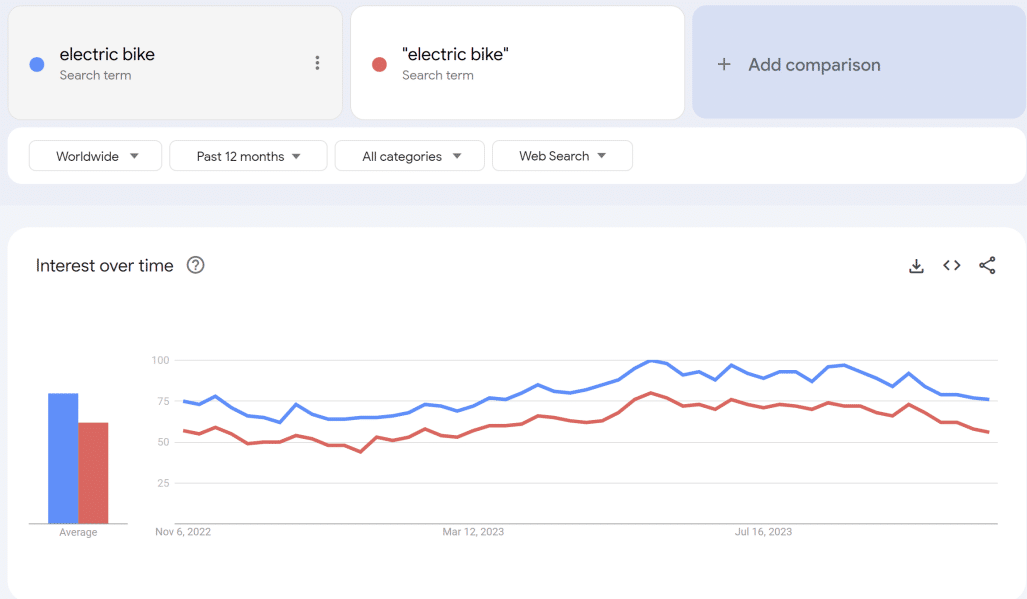 比如说我们在搜索关键词 Electric bike 时,关键词加上双引号的绝对匹配热度一般是要低于广泛匹配的热度。