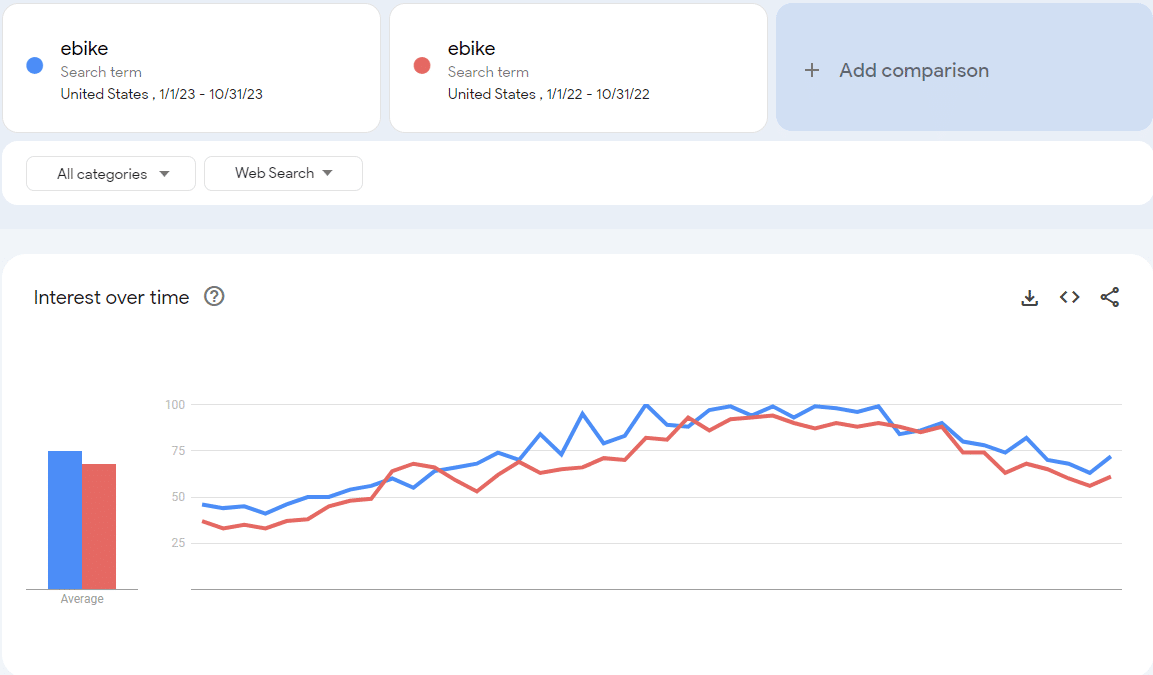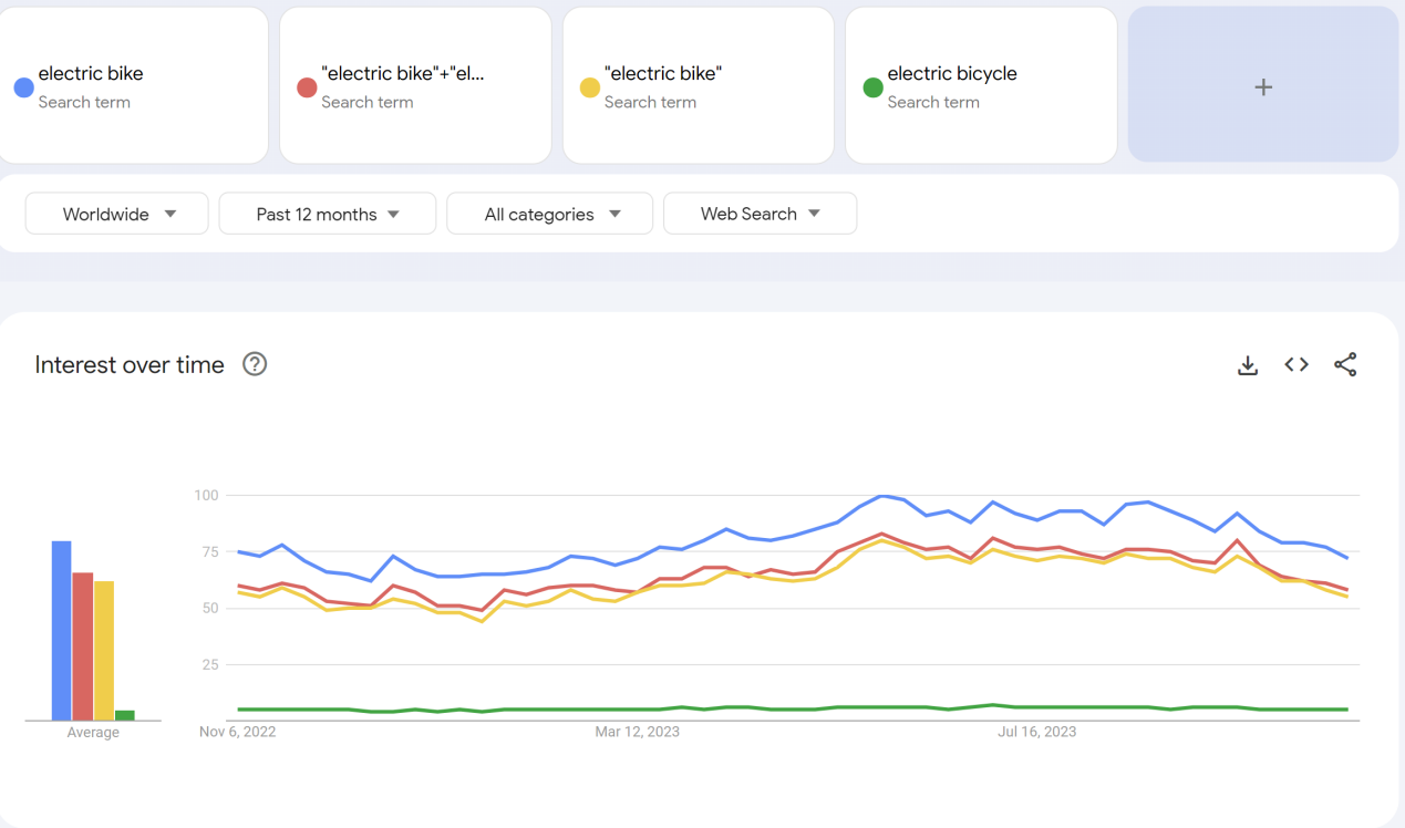 Note:由于Google Trends 的数据来源是从Google数据库中取样而来的,所以红色柱(“electric bike”+”electric bicycle”)的热度值不会完全等于黄色柱(“electric bike”)+绿色柱(“electric bicycle”)的热度值之和。