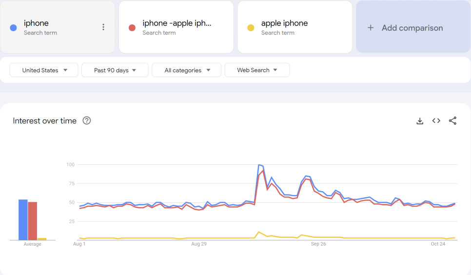 同样的,我们也可以使用减号 - 来排除某个关键词的搜索热度,如下红色柱是 apple -apple iphone 的搜索热度。