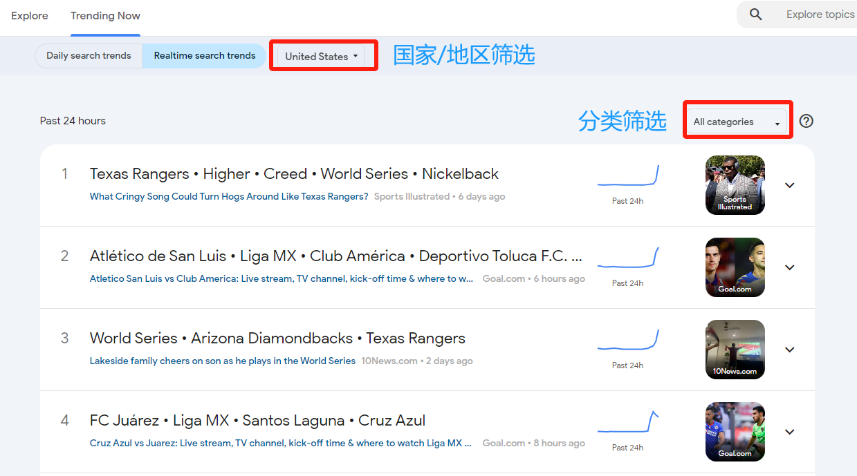 使用“Trending Now”功能,可以查看实时热搜和当日热搜,当前支持: