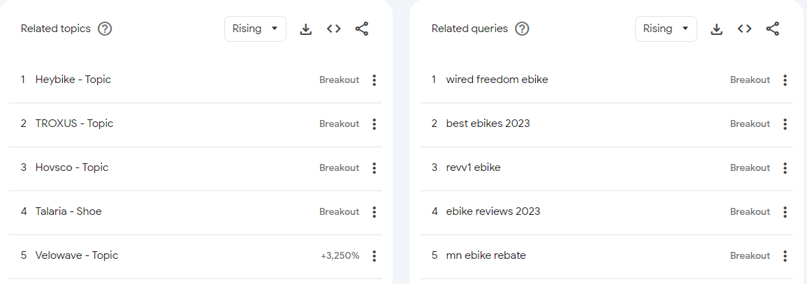 这其实是两个非常有用的功能,例如下图是搜索关键词“Ebike”(US地区,最近12个月)的“相关主题”和“相关搜索词”,我们可以发现“相关主题”中很多Ebike品牌的热度有非常大的提升,这说明这些品牌可能近一年内的营销力度比较大,而在“相关搜索词”中,非常多的用户在搜索“Best”、“Review”、“Rebate”之类的关键词,我们有可能从中找到一些热度上升比较快的内容宣传角度,来捕获用户的搜索意图。
