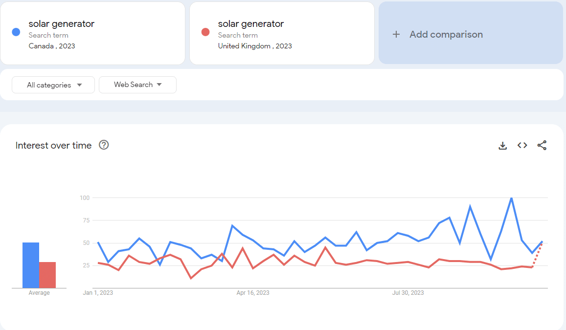 假设我们作为储能产品厂商,由于营销资源有限,想把有限的资源投入到市场需求更大的国家时,就可以在设定同样关键词的基础下,对比不同国家对这个品类的热度大小和趋势,来作为我们决策的依据。