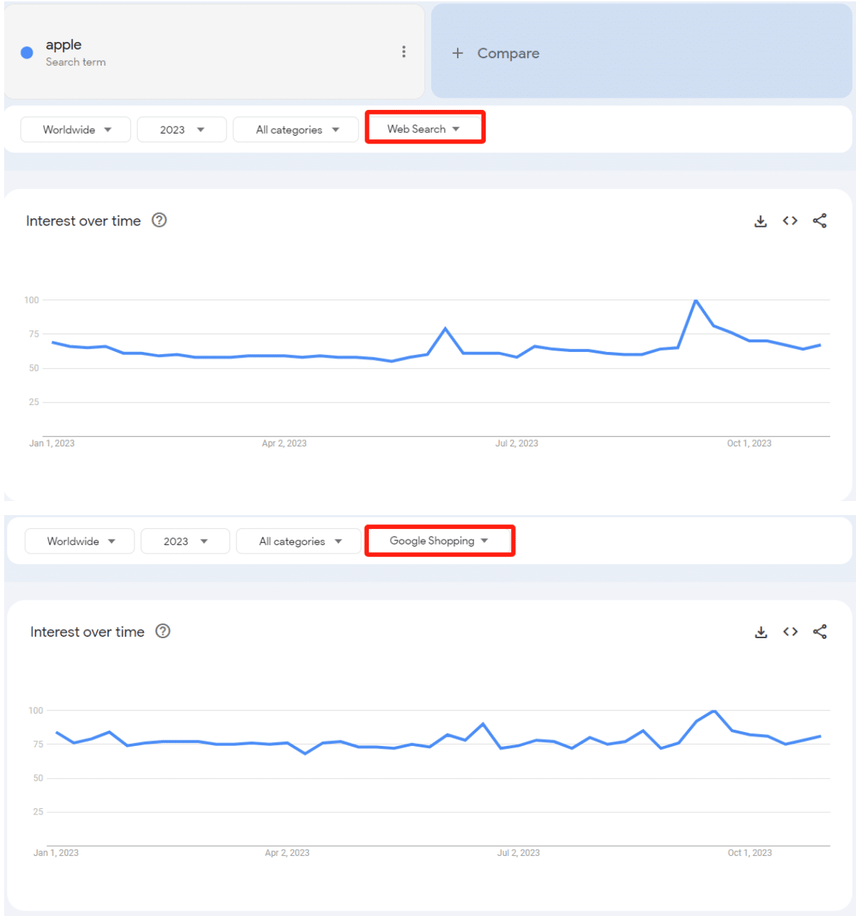 从上图我们会发现,搜索关键词“Apple”时,在Web搜索和Google Shopping购物搜索上的趋势,其实也是会有一定差异的。