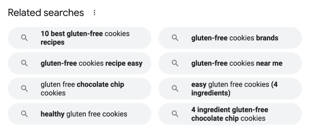例如,如果我们点击上图中的“4 ingredient gluten-free chocolate chip cookies”并向下滚动到相关搜索,我们会看到更多关键词提示: