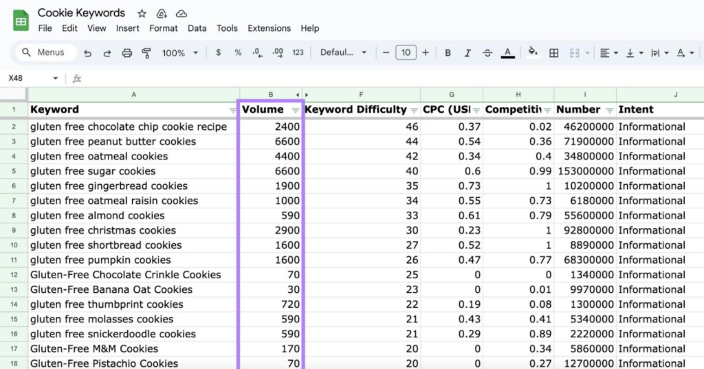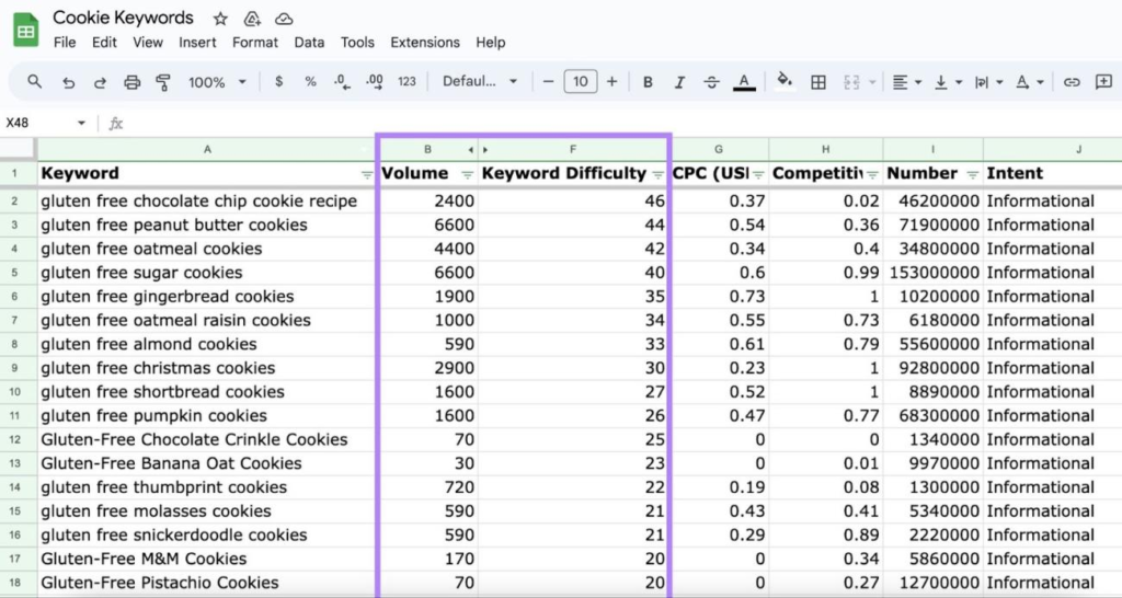 KD得分高的关键词通常更难排名。可以考虑从Excel表格中删除KD>49 的所有关键词。