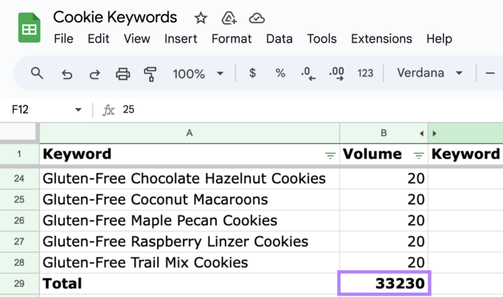 接下来,统计所有关键词的总搜索量,在我们的示例中,总搜索量为33,230。