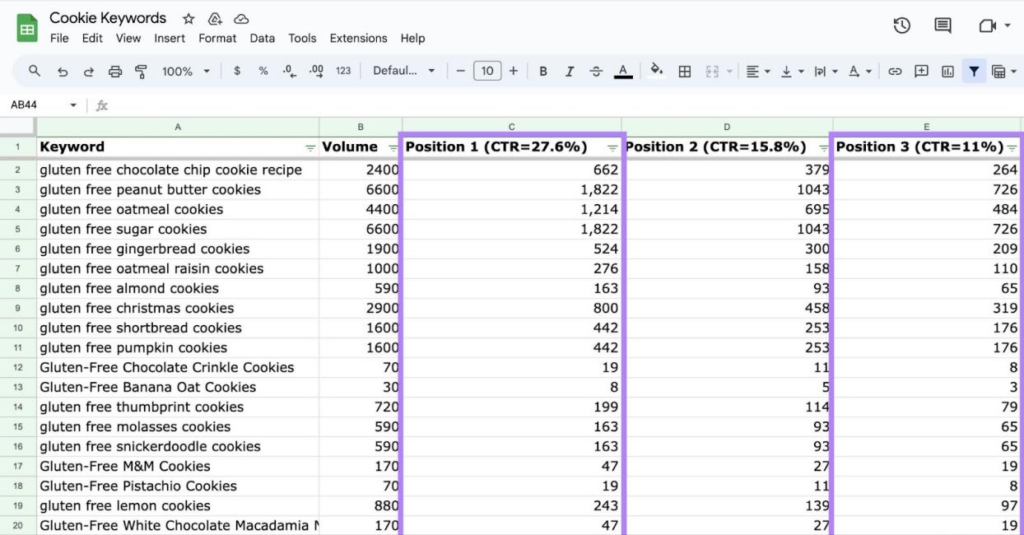 我们可以使用Backlinko的平均点击率数据来估算关键词的流量潜力。只需将搜索量乘以相应排名位置的百分比即可。