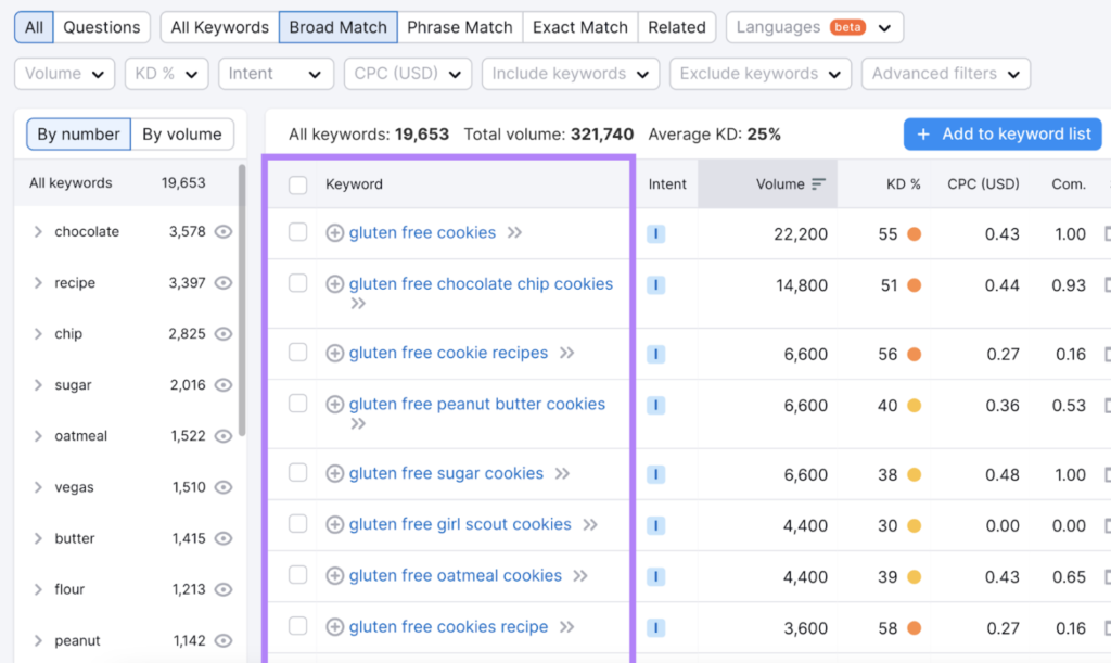 您可以使用不同的过滤器来查找与网站最相关的关键词。